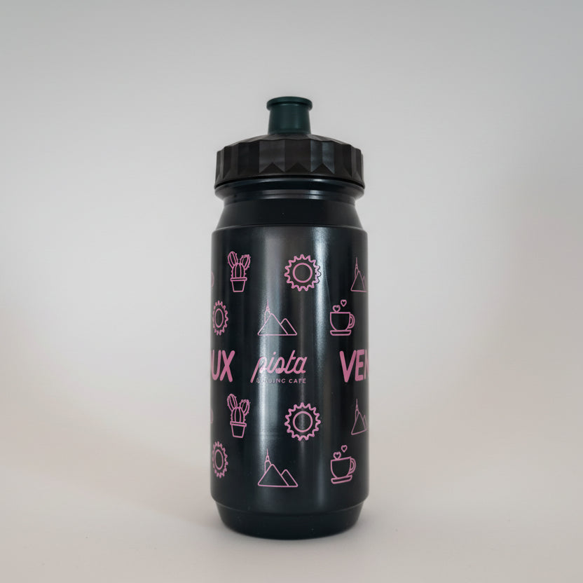 Durable 550ml water bottle, forest green with Pista icons in a pink pattern. Black cap.